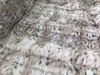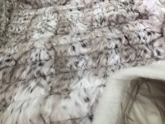 Одна сторона -основной цвет черный с мелким геометрическим рисунком; вторая сторона плащевая 30г/мт2 цвет корица . Покрытие DWR, стежка ч/з 7,5см. Утеплитель каротерм 150г/мт2