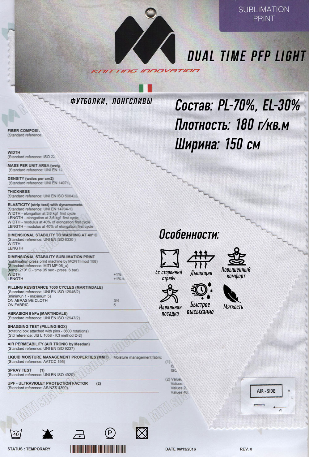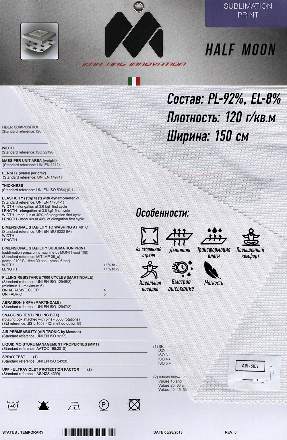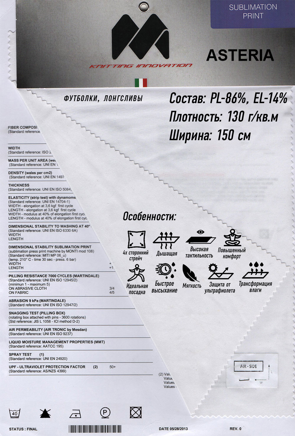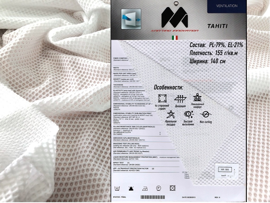 Плотность 150 г/м2. Четырехсторонний стрейч, дышащий, мягкий. Высокая тактильность, идеальная посадка. Быстро сохнет, трансформирует влагу, защищает от ультрафиолета.