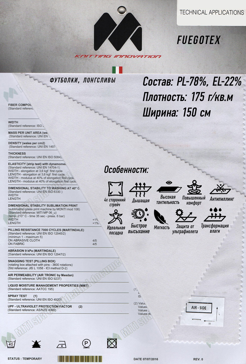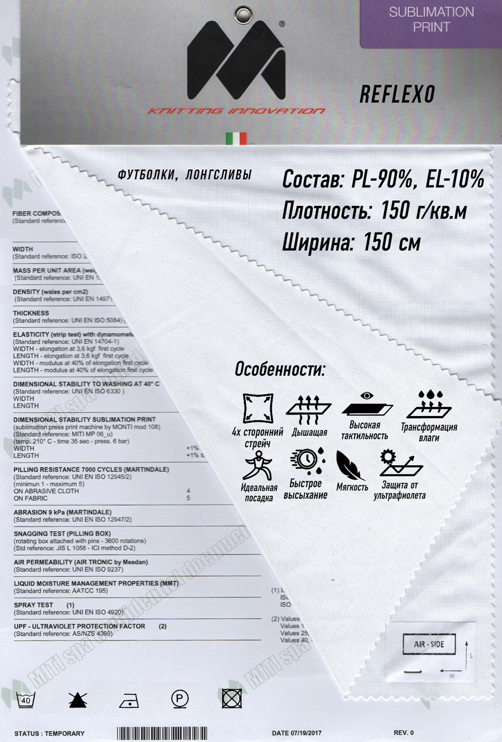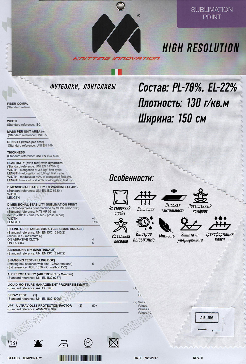 Плотность 150 г/м2. Четырехсторонний стрейч, дышащий, мягкий. Высокая тактильность, идеальная посадка. Быстро сохнет, трансформирует влагу, защищает от ультрафиолета.
