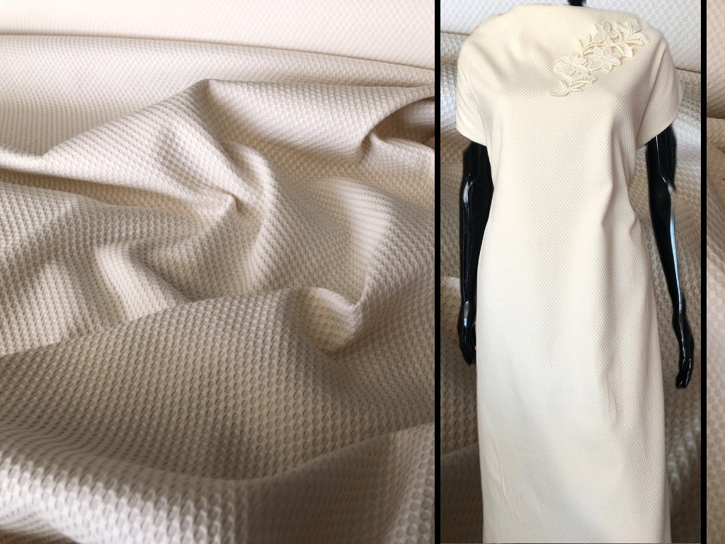 Плательно-костюмный жаккард стрейч сливочного цвета. Мягкий. пластичный, слабая сминаемость.