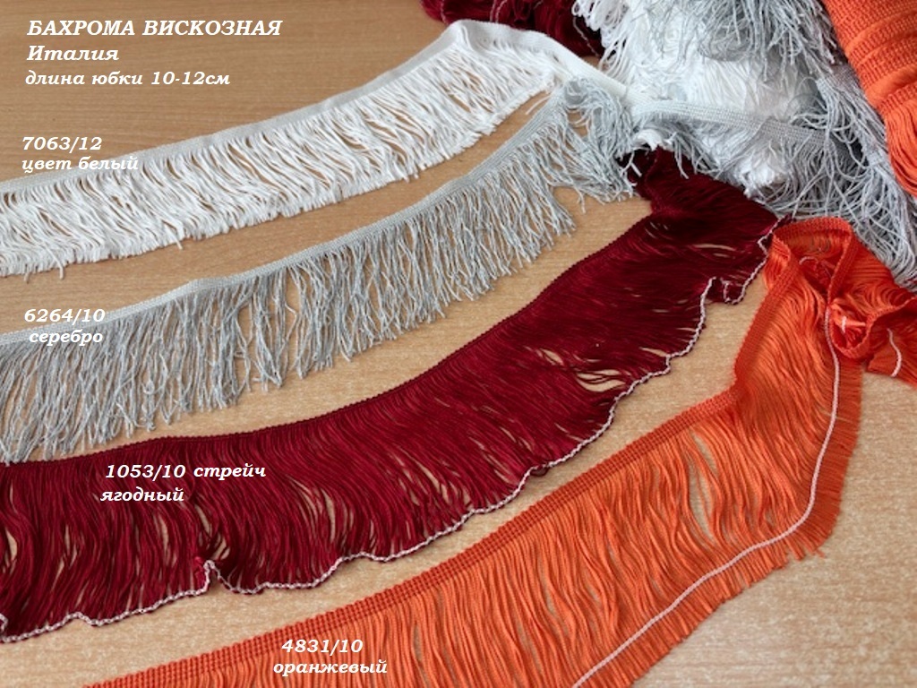 Вискозная бахрома в 4 цветах: белый, ягодный, оранжевый, серебристый (вискоза+люрекс).